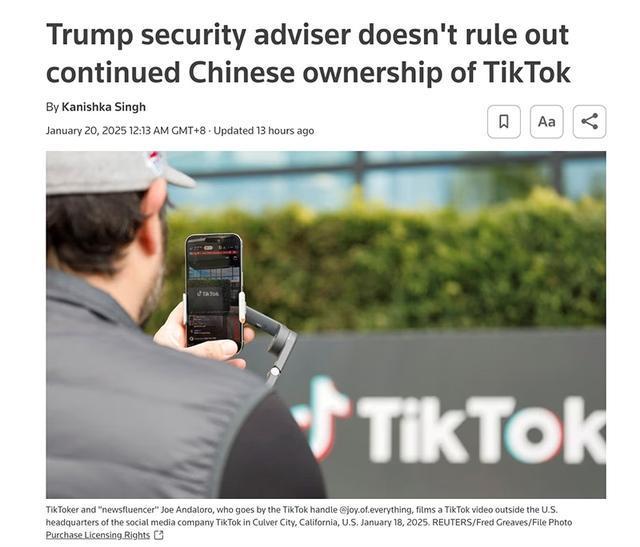 沃尔茨在接受采访时称,特朗普正致力于“拯救TikTok”,他不排除中国公司继续拥有所有权,但需设置“防火墙”,以保障数据在美国本土的安全。此前,特朗普曾表示,在其周一就任总统后,“极有可能”给予TikTok90天的禁令暂缓期。然而,特朗普在国会的部分共和党同僚,对延长TikTok禁令的提议持反对态度。美国参议院情报特别委员会主席、共和党参议员汤姆·科顿与皮特·里基茨在周日发布的联合声明中指出,“不存在任何法律依据,能够对(禁令的)生效日期进行任何形式的‘延期’” 。TikTok的命运悬而未决,特朗普政府内部对如何处理该应用存在分歧,共和党内部一些人则坚持要求字节跳动出售TikTok,知情人士称平台未与美方达成任何协议。TikTok的未来走向,仍有待进一步观察。举报/反馈